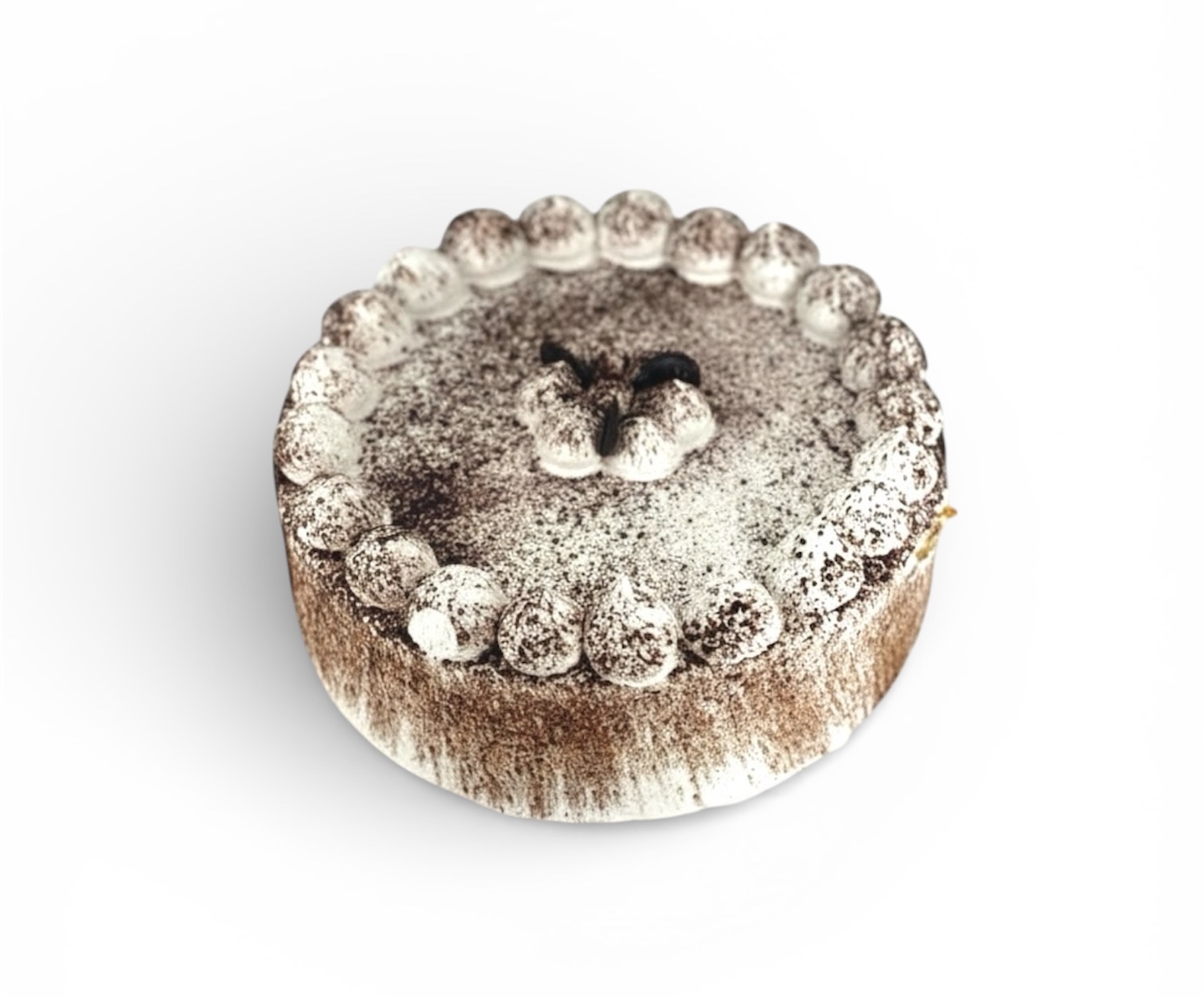 Классический шоколадный и белый бисквиты прослоены взбитыми сливками со вкусом шоколд. Оформлен взбитыми сливками со вкусом Тирамису, на поверхности какао. Вес - 680 гр