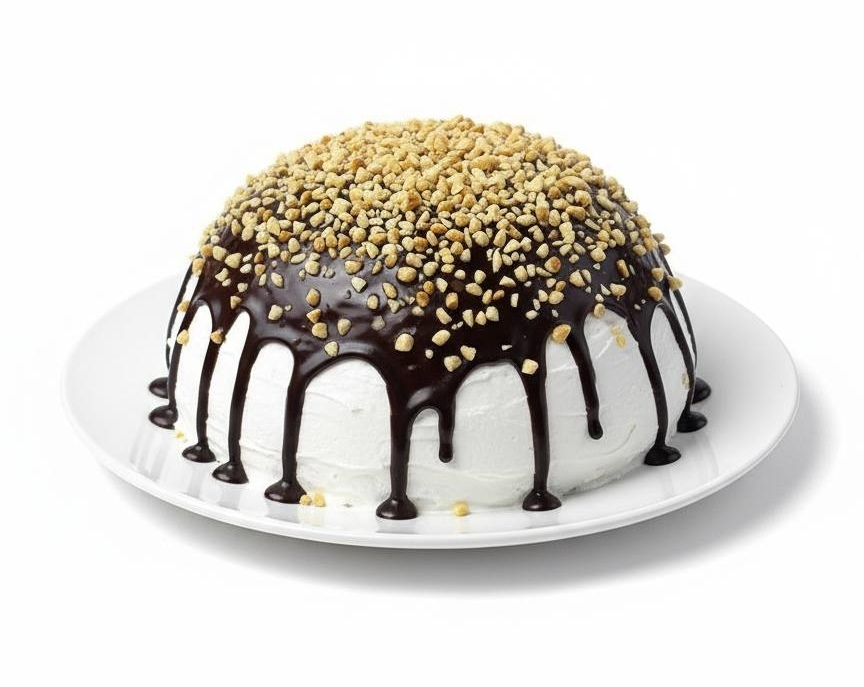Кусочки шоколадного и белого бисквитов, пропитанные взбитыми сливками и сметаной, в прослойке фруктовый конфитюр и жаренный арахис. Торт оформлен мягкой шоколадной глазурью и арахисом. Вес - 850 гр
