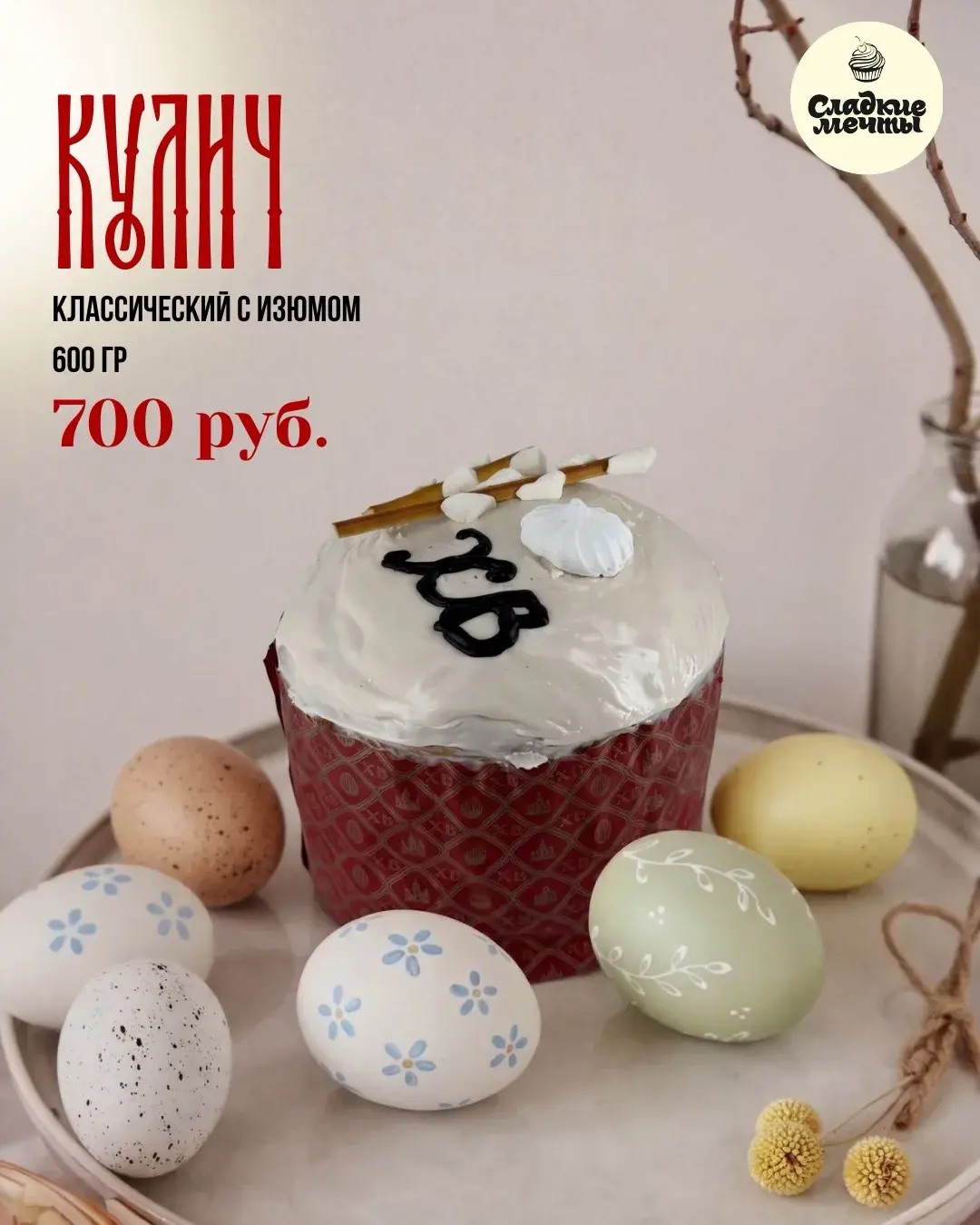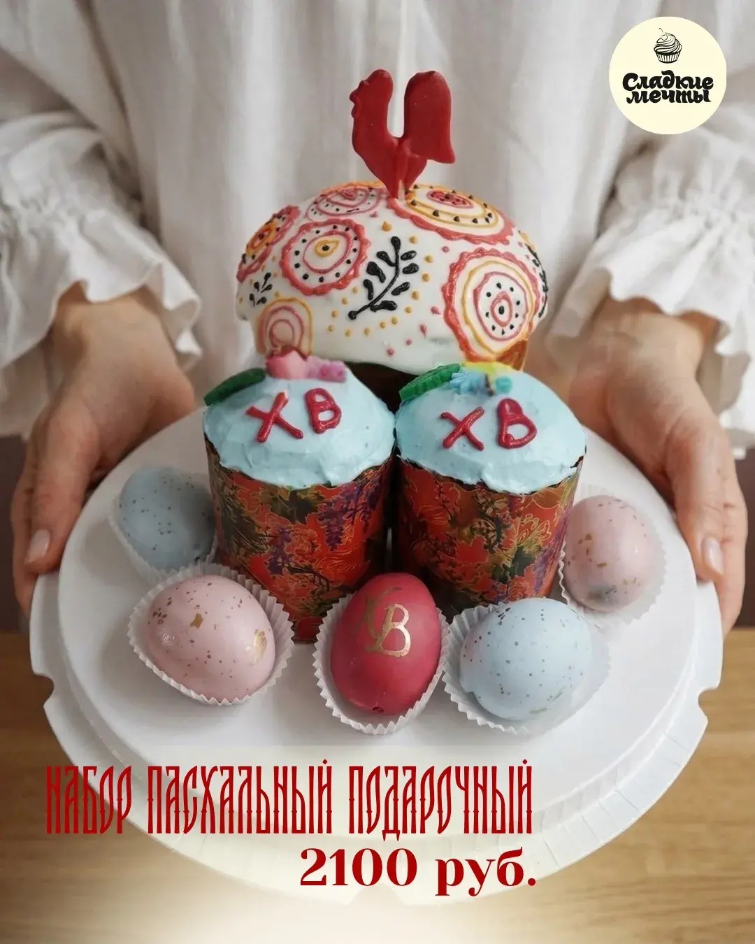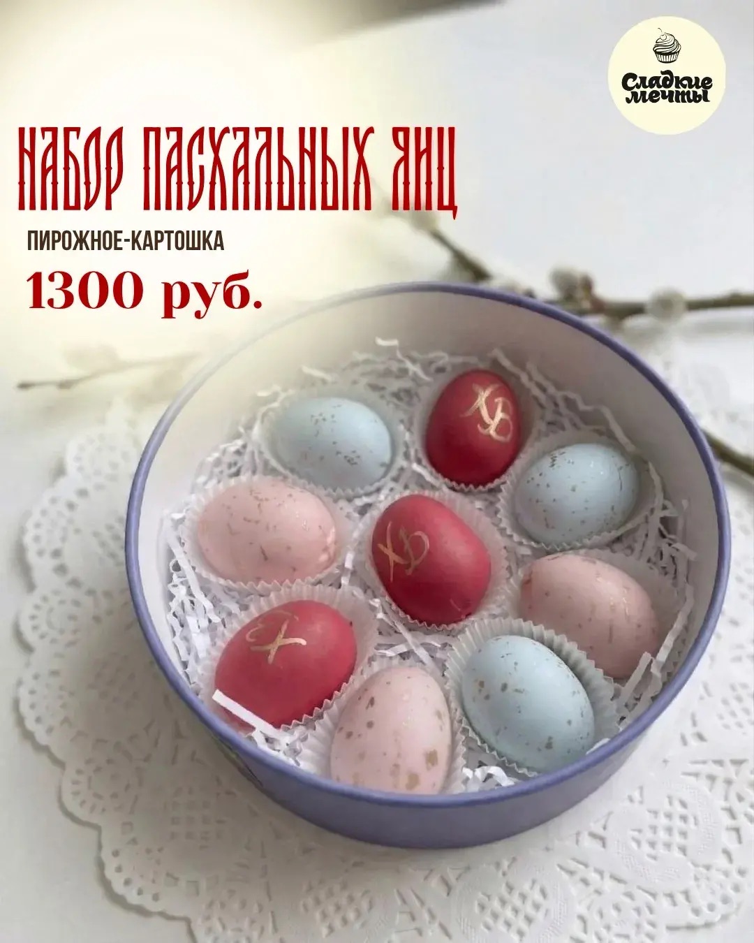 В наборе 3 кулича разного размера и веса, 3 пасхальных яйца
